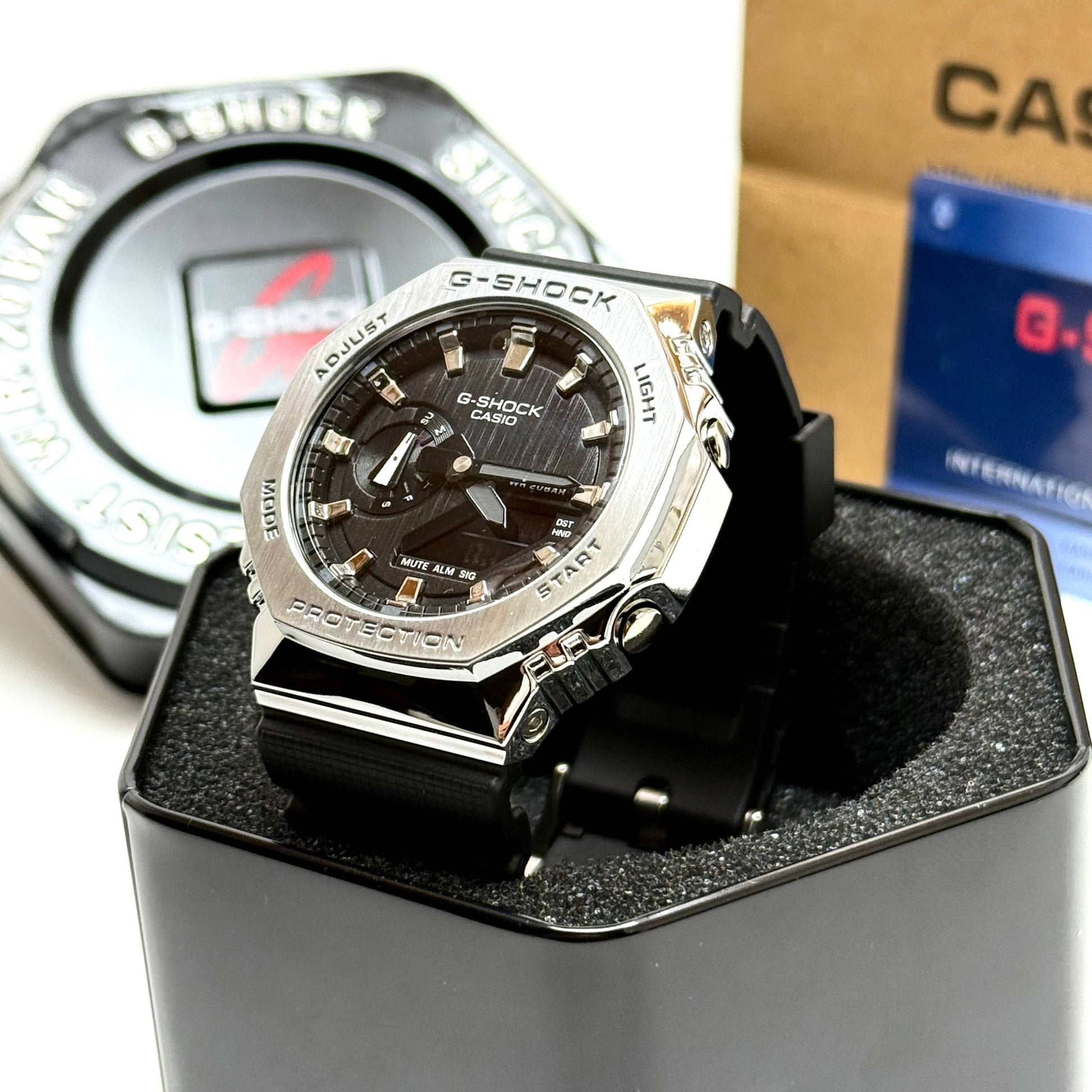 Clean, powerful and premium. This full-metal G-SHOCK delivers a sharp silver finish with a modern analog-digital display for everyday toughness and street-luxury style.